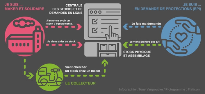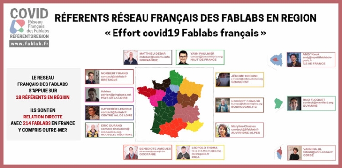 - Travailler avec Makery.info pour soutenir le maillage des référents territoriaux du Réseau Français des Fablabs. Et cela pour relayer l’information et coordonner les besoins de la mobilisation citoyenne au plus près des territoires et donc d’informer les citoyens sur les possibilités de trouver/créer localement le matériel nécessaire à leur besoin.