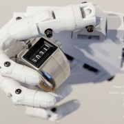 Plus loin, nous stoppons devant deux autres vidéos. Poor Magic de Jon Rafman, qui alterne une avalanche de personnages 3D, se bousculant et tombant sans fin, avec des textures plus organiques (i.e. des images d’une coloscopie…) dans lesquelles s’incruste la silhouette d’un avatar bleu. I Am Sitting In A Room d’Antonio Roberts, qui s’inspire d’Alvin Lucier, nous permet de visualiser la détérioration de fichiers informatiques, matérialisée par la dégradation d’un texte à l’écran. Nous pénétrons ensuite dans la Salle 4 entièrement consacrée à France Cadet. On y retrouve ses androïdes, parfois dans d’étranges postures, qui nous dévisagent en clignant des yeux. On y découvre également un bestiaire (Hommage au Dodo, Galerie d’espèces disparues), un cabinet de curiosités sous forme de vieilles cartes scolaires (Leçon de choses 2.0), des fichiers bio et anthropométriques (Facs Face ++) et une installation vidéo en sept tableaux retraçant les étapes de la gestation d’un robot (Demain Les Robots). Ces créations offrent une deuxième lecture, un surcroît d’information, grâce à l’utilisation de lampes avec filtres polarisants qui agissent comme révélateur d’encre invisible.