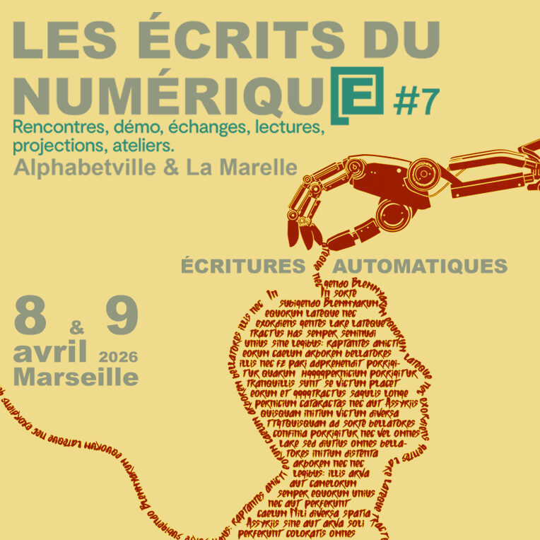 La septième édition de cette manifestation portée par Alphabetville (Colette Tron et Cécile Portier), laboratoire des écritures multimédia, en coordination avec La Marelle, lieu de résidence de création littéraire, est liée aux interactions de l’écriture et de la lecture avec les applications d’intelligences artificielles génératives… Au travers de rencontres, démos, échanges, lectures, projections et ateliers, il s’agira d’aborder une généalogie et une histoire de l’automatisation de l’écriture et d’en produire une approche critique…