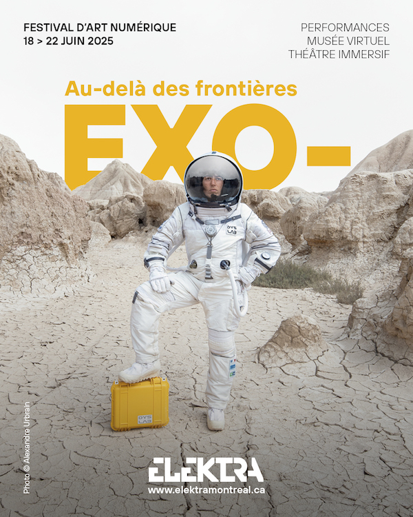Le festival d’art numérique Elektra revient avec une nouvelle thématique : EXO – Au-delà des frontières. Cette édition 2025 qui se déroulera du 18 au 22 juin proposera une série de performances audiovisuelles, d’expériences participatives et d’œuvres interactives. L’idée est bien d’essayer d’aller voir « au-delà », de se tenir à la lisière de l’inconnu, dans des territoires inexplorés entre intelligence artificielle, exobiologie et réalités parallèles […] et d’interroger notre relation à l’altérité, à la technologie et aux mondes qui échappent à notre perception.